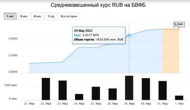 Курс доллара США за прошлую неделю потерял 7,82% и составил на закрытии пятничных торгов USD/BYN 2,9436. Просадка курса евро составила за неделю минус 7,00% и курс закрытия недели EUR/BYN 3,2631. Российский рубль вырос в цене (за 100 российских рублей) на 6,71% и поднялся до максимума марта в RUB/BYN 3,5341.