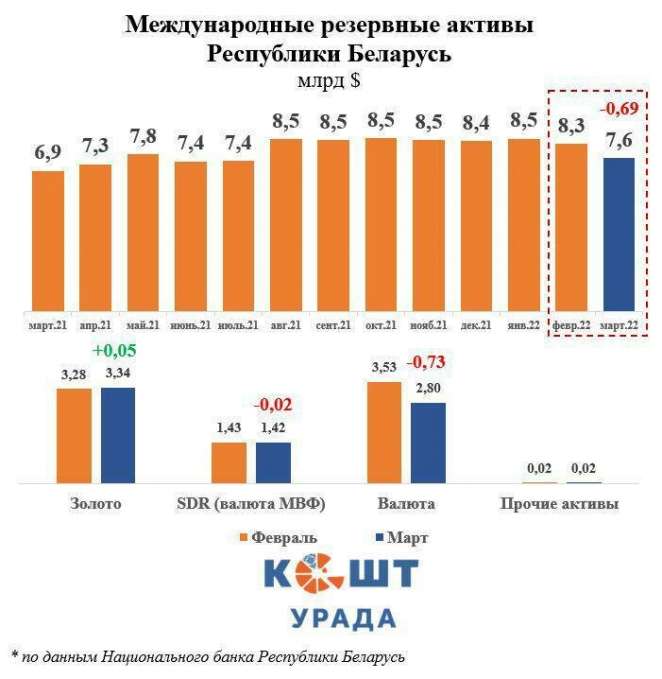 Стрессы и шоки в марте стоили золотовалютным резервам Беларуси $692,9 млн. Снижение составило 8,4 процента. За месяц до того ЗВР, кстати, тоже снижались. Тогда резервы полегчали на $259,1 млн или на 3 процента. В итоге на 1 апреля 2022 года их общий объем составил $7,57 млрд.