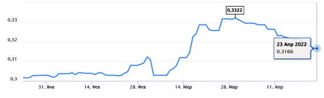 Валютная корзина Нацбанка в течение прошлой недели снизилась на 1,53% и достигла отметки в 0,3166 п.п., откатившись от максимума 29 марта 2022 года в 0,3322 п.п.