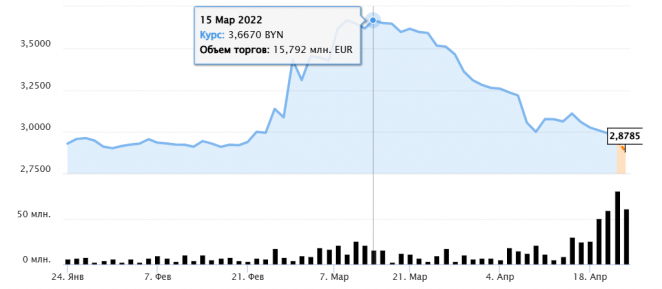 Пара EURBYN также продолжает снижение. Прошлая неделя пара закрыла на отметке EURBYN 2,8785, потеряв за неделю 5,88%. К началу года рост евро вышел в отрицательную зону и составляет -0,14. На пике марта курс поднимался до EURBYN 3,6670 и рост составлял 27,21%.