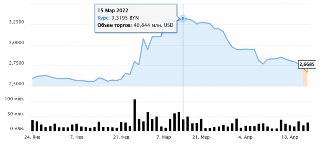 Курс доллара США за неделю снизился на 5,63% до USDBYN 2,6685. С начала текущего года темп роста пары USDBYN сохраняется, но уменьшился до 4,73%. Напомним, что максимального значения курс «бакса» достигал 15 марта и составил тогда USDBYN 3,3195. По отношению к началу года в тот момент увеличение курса составляло 30,27%.