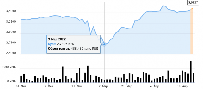 А вот российский рубль, виновник всего этого «банкета», укрепился к концу прошлой недели на 2,87% за неделю. Курс пары RUBBYN 3,6227 за 100 российских рублей. Пара RUBBYN оттолкнулась от минимума 9 марта 2022 года, когда просадка российской валюты к белорусской составляла -20,18%.