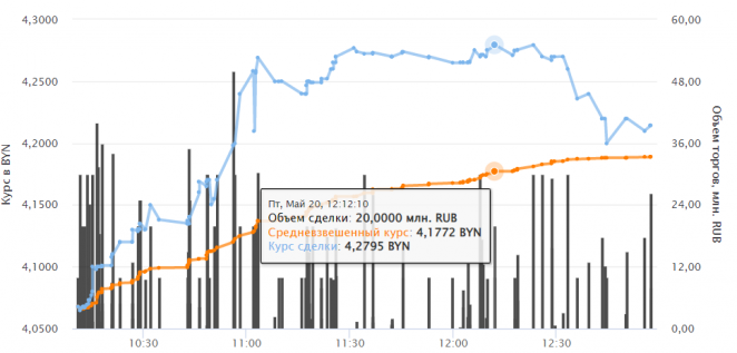 В пятницу, 20 мая, на торгах валютной секции БВФБ курс пары RUBBYN поднимался в моменте до RUBBYN 4,2795, но по итогу торгов зафиксировался на отметке RUBBYN 4,1892 за 100 российских.
