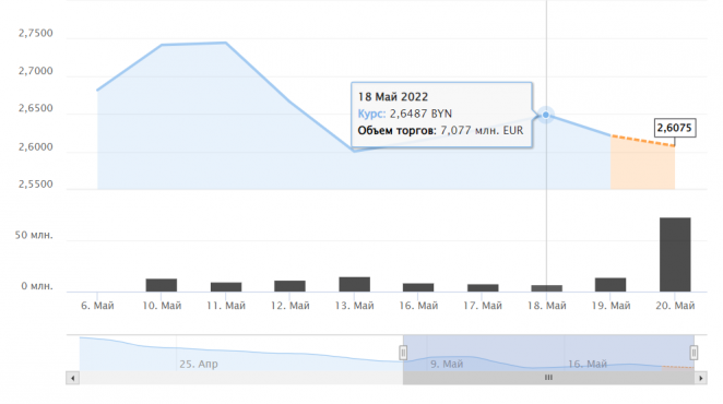 Курс евро также за неделю остался почти без изменений, пара EURBYN выросла на 0,27% (к началу года снижение остаётся 9,54%). По итогам торгов в пятницу курс остановился на EURBYN 2,6075, хотя в течение недели пара EURBYN поднималась до EURBYN 2,6487.
