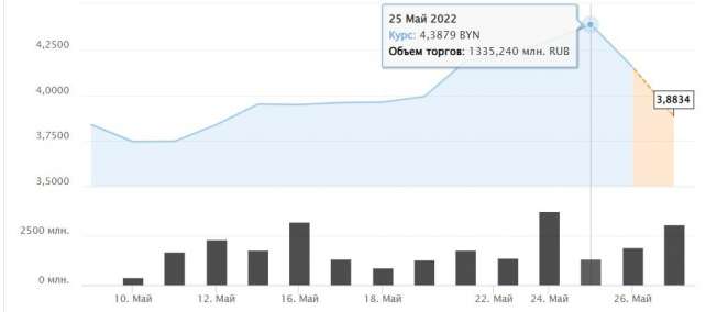 Пара RUB/BYN открывала торги 25 мая с рекордной отметки в RUB/BYN 4,4398, по итогам того дня Нацбанк установил максимальный курс в RUB/BYN 4,3879. Укрепление пары к началу года в тот момент составляло также рекордные +27,85%.