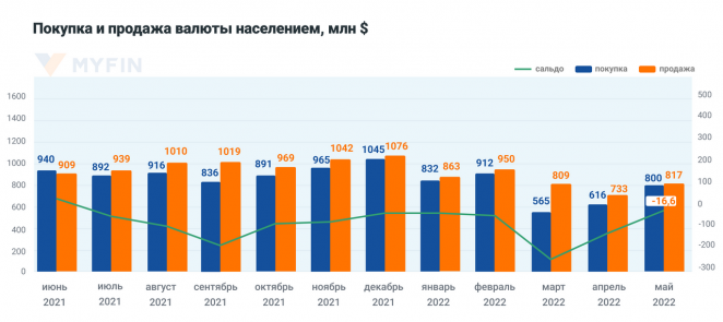 В мае физлица купили $800,3 млн в эквиваленте, а продали – $816,9 млн. В итоге объем чистой продажи валюты составил всего $16,6 млн.