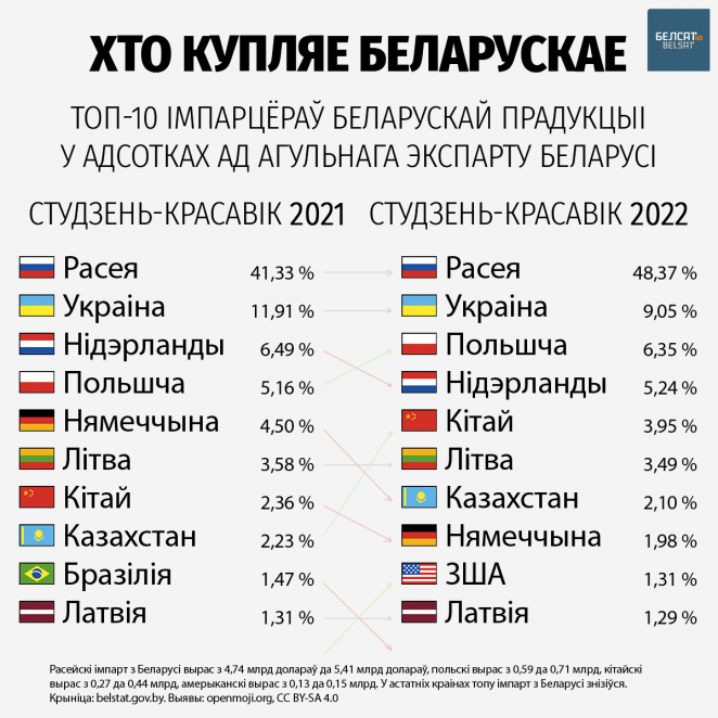 Как свидетельствует статистика, десяток стран, куда поставлялись наибольшие объемы товаров из Беларуси (в денежном эквиваленте) в январе – апреле 2022 года, почти не претерпела за год изменений в своем составе. Разве что из топ-10 ушла Бразилия, доля белорусского экспорта в которую составляла 1,5% от общего экспорта за 4 месяца 2021 года (168,3 млн долларов). Эта страна –традиционный покупатель белорусских калийных удобрений, которые сейчас попали под санкции.