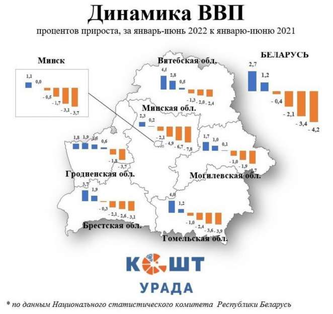 Меньше всего по итогам января-июня составило снижение валового регионального продукта в Могилевской (-2,7%) и Витебской (-2,4%) областях. Таким образом, падение в большей мере затронуло наиболее экономически развитые регионы.