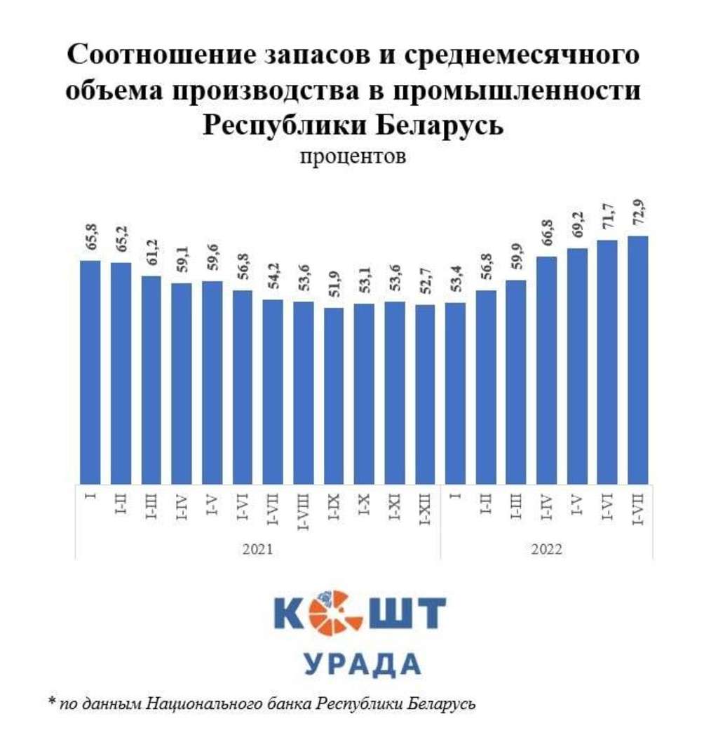 Помимо общего снижения показателей сферы промышленности, обращает на себя внимание факт роста складских запасов. Если в январе они составляли 53,4% среднемесячного объема производства, то к июлю этот показатель увеличился до 72,9%. Казалось бы, в неблагоприятных экономических условиях предприятия должны скорее сокращать выпуск и распродавать запасы.
