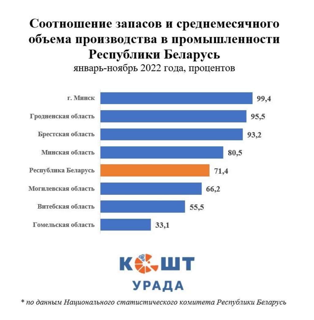 «Это максимальный объем в текущем году. В целом в течение года в этом году объемы складских запасов существенно колебались. Изменение логистики поставок, потери рынков и переориентация на новые направления сначала привели к тому, что запасы в денежном выражении за январь – июль выросли почти в полтора раза – с BR 5,4 млрд в конце прошлого года до BR 8 млрд в июле, что соответствует росту с 52,7% до 72,9% среднемесячного объема производства. Дальше ситуация стала улучшаться, однако уже после августа запасы снова пошли в вверх», – говорят эксперты проекта «Кошт ураду».