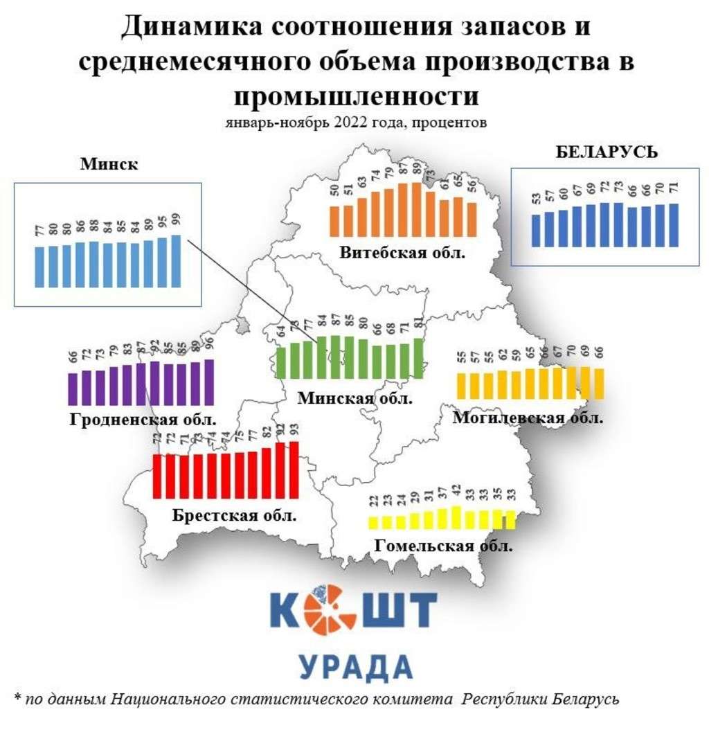 Эксперты также напоминают, что рост запасов в промышленности наблюдается во всех областях страны. С ноября прошлого года по ноябрь этого года больше всего они выросли в Брестской области – в 1,8 раза в денежном выражении, или с 64,8% до 93,2% среднемесячного объема производства. Наименее в денежном выражении запасы приросли в Минской области – на 19,5%, или с 74,3% до 80,5% среднемесячного объема производства.