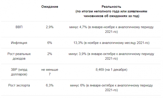 Окончательную картину по итогам года можно будет увидеть только в начале 2023-го, но уже сейчас видно, что достичь поставленных правительством целей удалось только по сохранению объемов золотовалютных резервов. Но большинство основных показателей вместо ожидаемого роста ушли в минус. Одни из главных провалов — разогнавшая инфляция, которая держится на уровне двухзначной цифры, и падение доходов населения.
