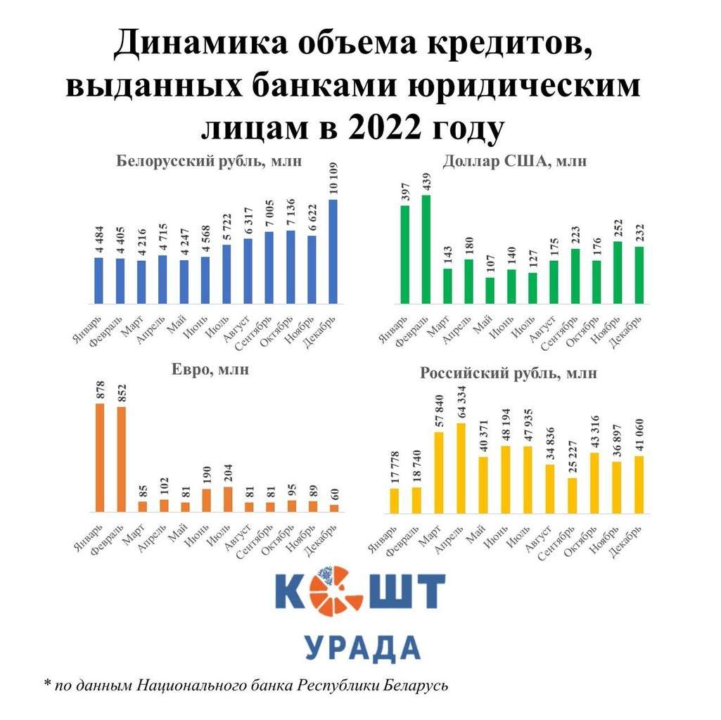 Заметно, что в марте резко, в десятикратном размере, упало кредитование в евро, с 852 млн до 85 млн евро за месяц. Ничего удивительного, ведь европейский рынок для Беларуси фактически оказался закрытым. При этом с марта картина практически не изменилась, был незначительный рост в середине лета до 204 млн, но к декабрю показатель рухнул до рекордно низких 60 млн. Судя по всему оставшиеся «крохи» позволяют обслуживать тот небольшой объем торговли с Европой, что еще остался.