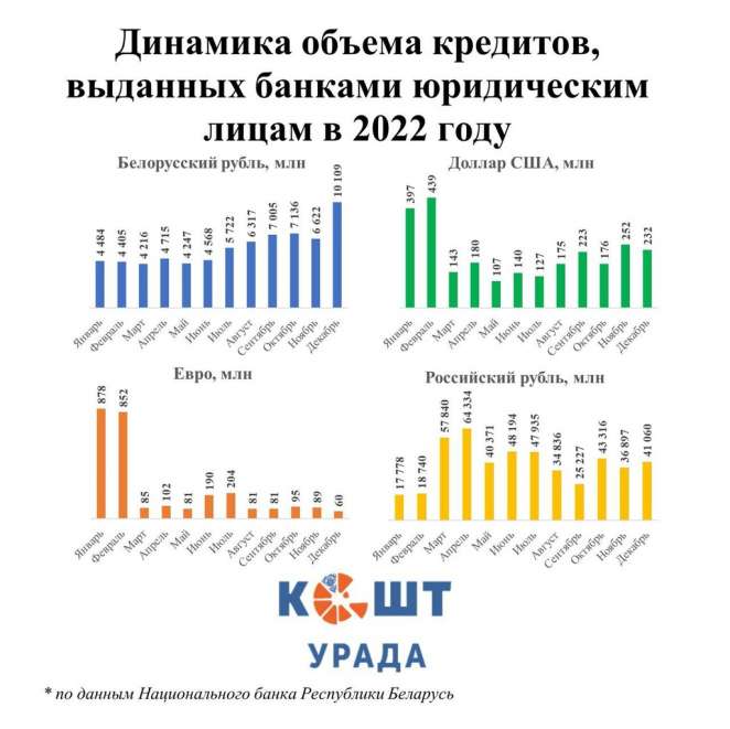 Что же касается национальной валюты, можно увидеть, что с начала года и до ноября наблюдается плавный рост с 4 млрд 484 млн до 6 млрд 662 млн за месяц. Но в декабре происходит аномальный скачек сразу до 10 млрд 109 млн. Значительное увеличение кредитов в беларуских рублях - это не столько заинтересованность национального бизнеса в инвестициях. Это, скорее, миллиарды рублей, направленные на поддержание жизни в предприятиях, испытывающих большие проблемы в связи с закрытием традиционных рынков сбыта, а также очередная “доза” для зомби-предприятий, многие из которых эти деньги отдать не смогут, а некоторые — откровенно не планируют.