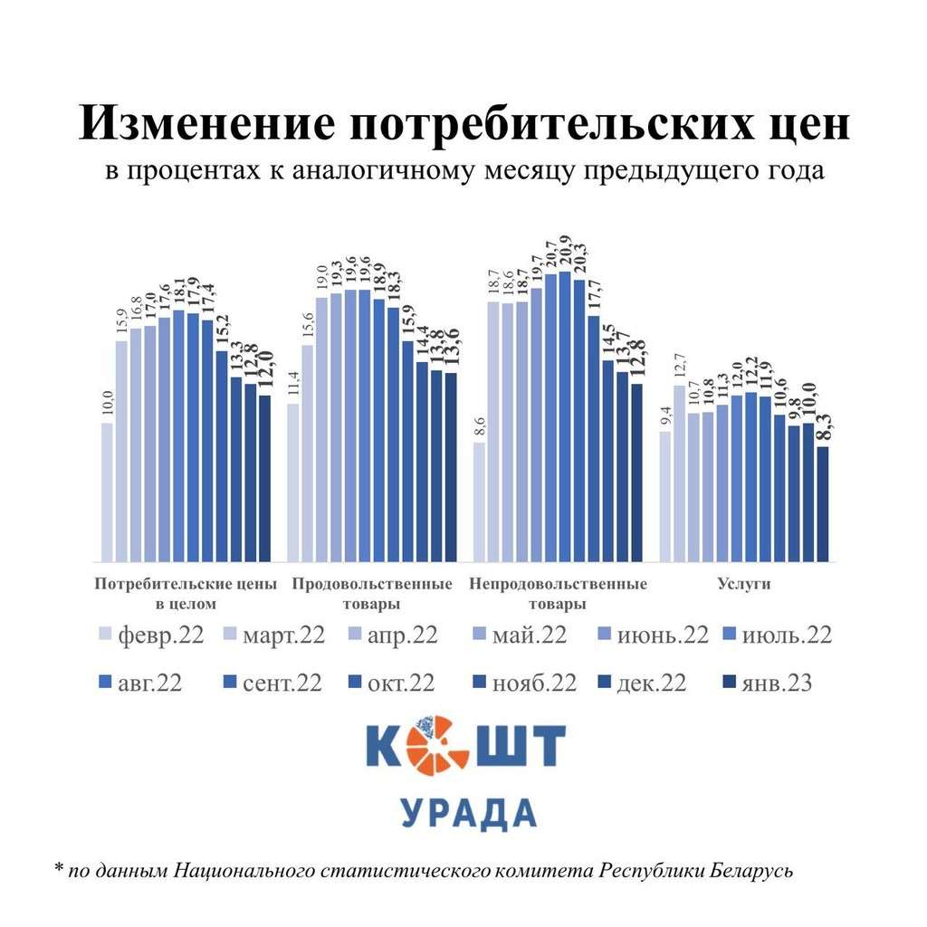 Начало прошлого года беларуская экономика встречала с меньшим уровнем роста цен: инфляция января 2022 года составляла 10%. Сейчас темпы несколько выше. Но они уже не достигают таких высоких значений, как в середине прошлого года.