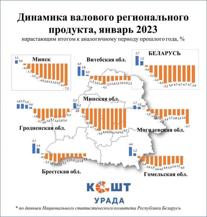 В январе 2023 года по отношению к аналогичному месяцу прошлого года сильнее всего региональная экономика упала в Минской области. Спад составил впечатляющие 8,2%. Чуть меньше, но не менее значимым оказался спад в Минске — минус 7,3%. Как мы уже отмечали ранее, особенностью беларуского кризиса в экономике является то, что наиболее сильно он проявляется в передовых регионах и передовых отраслях, где связи с внешнеэкономическими партнерами были наиболее сильными.