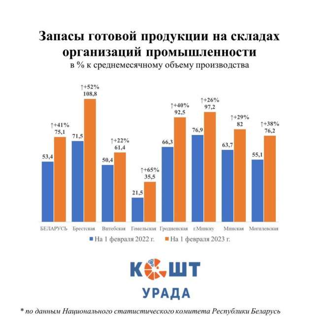 Если трехнедельный складской запас — это ситуация в среднем по стране, то по регионам она существенно различается. Так в Брестской области на 1 февраля 2023 года складские запасы превышали месячный объем производства (108,8%), в то время как в Гомельской только их было только на треть месячного объем производства (35,5%). То есть ситуация на сладах очень разнородна. Почти месячный объем лежит на складах Гродненской области и в столице.