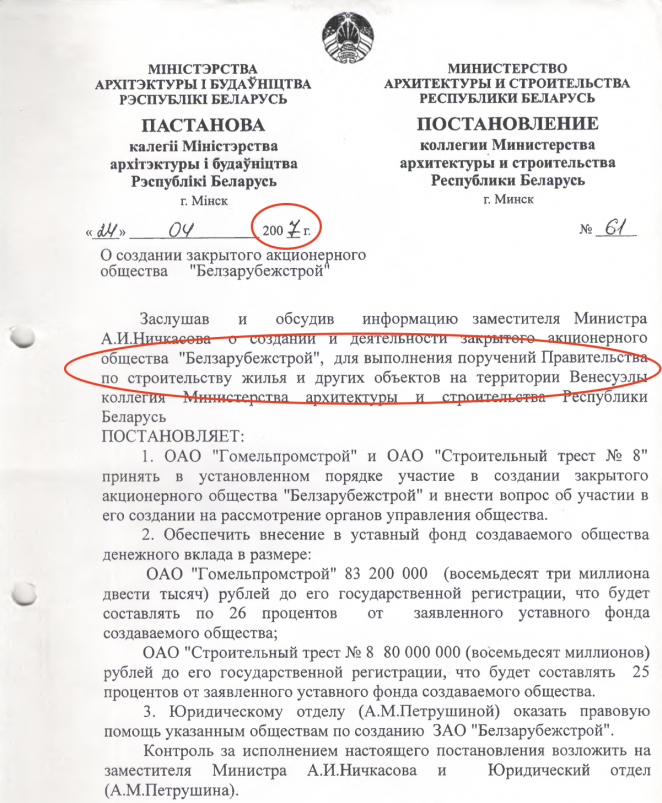 И заводы (например, по сборке тракторов «Беларус» и грузовиков МАЗ), и жилье в Венесуэле строила компания «Белзарубежстрой». Она появилась в конце весны 2007 года. Ее основали «для выполнения поручений правительства по строительству жилья и других объектов в Венесуэле».