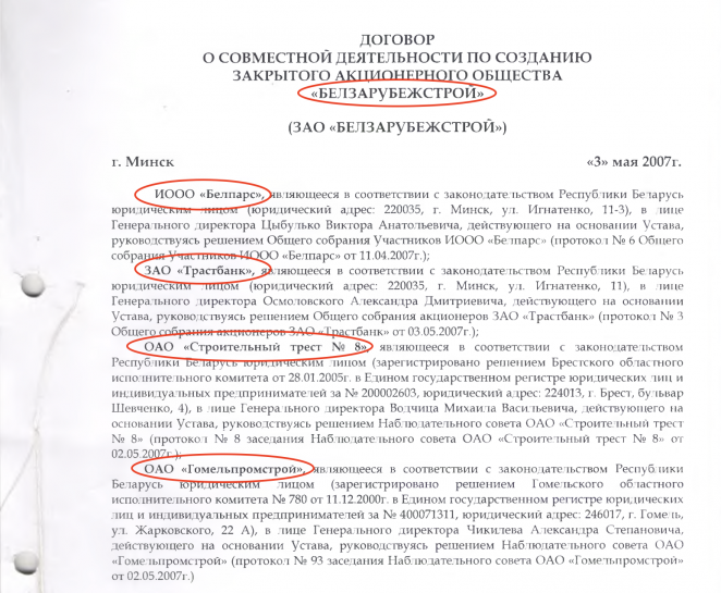 Учредителем компании выступили четыре предприятия. Два из них — «Гомельпромстрой» и «Строительный трест №8» — подчинены правительству, а два других, «Белпарс» и «Трастбанк», — частные. Кто же эти таинственные бизнесмены, составившие компанию властям?