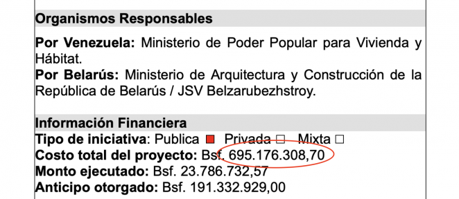 Помимо закупок сырья, у Беларуси в Венесуэле были и другие интересы. Вскоре после того, как Минск и Каракас заключили нефтяной контракт, в Венесуэле из-за наводнения без крова остались тысячи семей. Чавес запустил программу строительства жилья. Беларусь решила в этом поучаствовать, однако из-за недостаточного финансирования процесс тормозился.