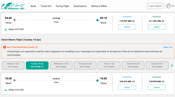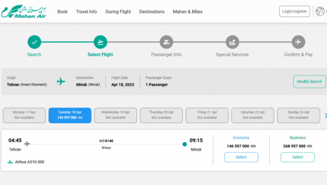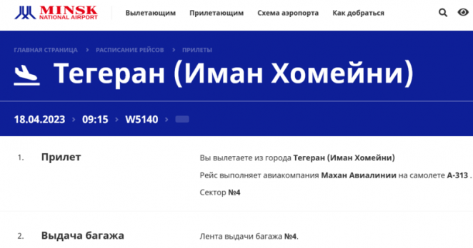 Представители Министерства транспорта обещали, что с 26 марта начнутся полеты иранской авиакомпании Mahan Air в Тегеран. Еще в ноябре 2022-го Департамент по авиации выдал перевозчику аккредитацию, но пока ни в сезонном расписании минского аэропорта, ни в системе бронирования самой компании этот рейс не появлялся. И вот теперь вдруг в расписании аэропорта Минск значится рейс этой самой Mahan Air, а на сайте перевозчика можно купить билеты.
