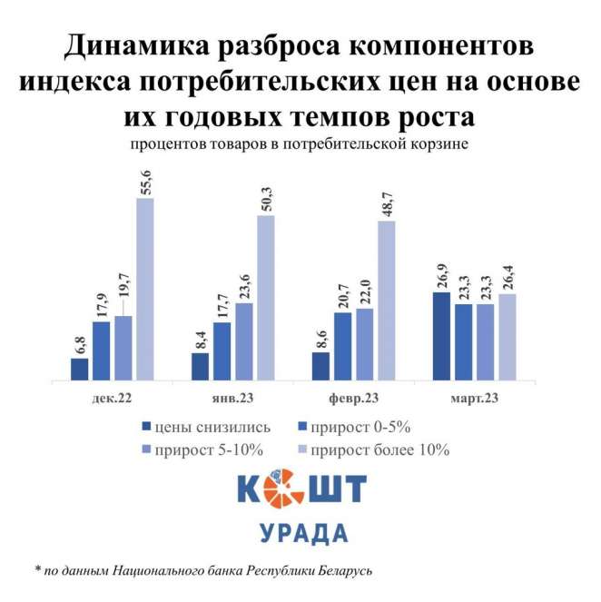 Снижение годовой инфляции хорошо видно на разбросе компонентов индекса потребительских цен. Есть сравнить данные за март, то становится очевидно, что доля товаров, подорожавших на 10% и более, перестала быть крайне высокой - сейчас это 26,4% товаров, входящих в индекс потребительских цен. Месяцем ранее доля сильно подорожавших товаров составляла 48,7%. Сохранилась на том же уровне доля товаров с ростом цен на 5-10% (сравните: 22,0% в феврале и 23,3% в марте). Аналогично с приростом цен в диапазоне 0-5% (20,7% против 23,3%). А вот доля подешевевших в годовом выражении товаров возросла с 8,6% до 26,9%.