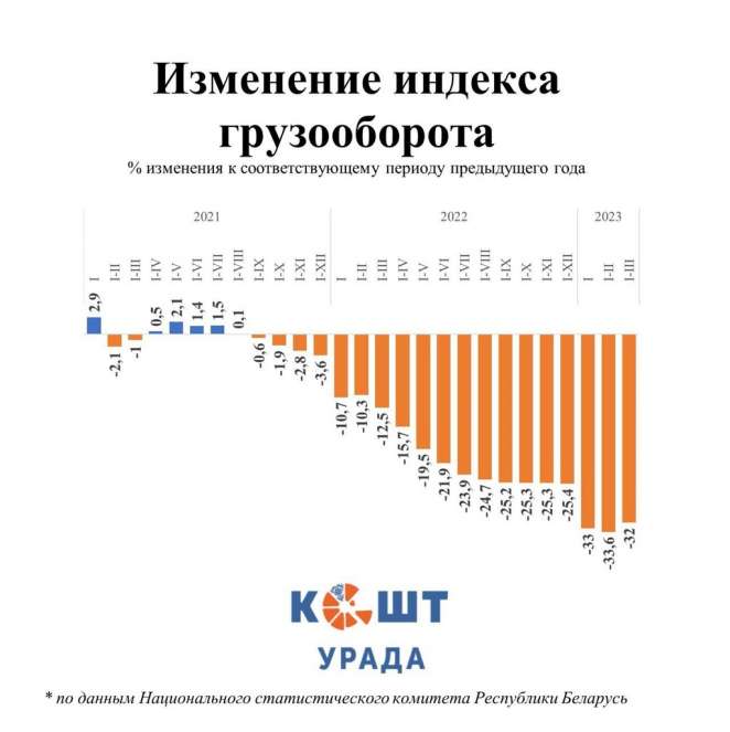 После того, как Польша закрыла погранпереходы, особенно страдает сфера транспорта. Болезненность давления на это место экономики очевидна. Так, общее снижение грузооборота за январь-март 2023 года составляет 32%. Входит, что Беларусь только за последний год не реализовала треть транзитного потенциала. А ведь сфера падала и ранее, то есть это потери по отношению к уже низкой базе 2022 года.