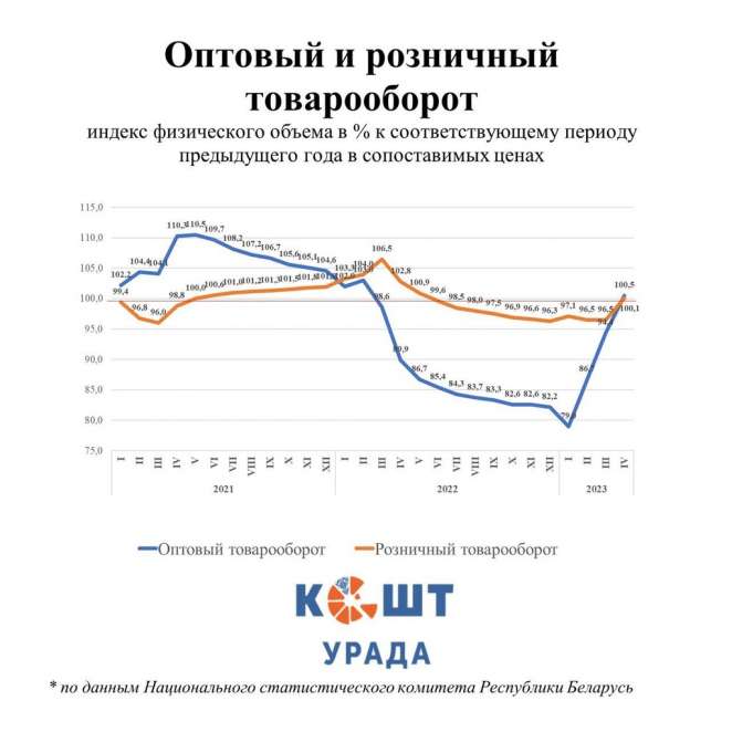 Улучшение показателей товарооборота в 2023 году происходит главным образом за счет столицы, где зарегистрированы ключевые оптовики. Также высокий рост фиксируется в Витебской области, где прирост оптового товарооборота за январь-апрель 2023 года достиг 54,6% к аналогичному периоду прошлого года. Сравните — Брестская область имеет по итогам четырех месяцев спад в 4,4%, Гродненская в 0,4%, Гомельская в 5,6%, Минская в 0,7%, Минск в 6,6%, а Могилевская и вовсе в 23%. От прочих областей Витебскую отличает наличие особой экономической зоны в Оршанском районе, через которую, вероятно, уже с 2022 года идет поток товаров на внешний рынок, особенно возросший на фоне санкционных ограничений. Вероятно, так обходят ограничения в отношении России.
