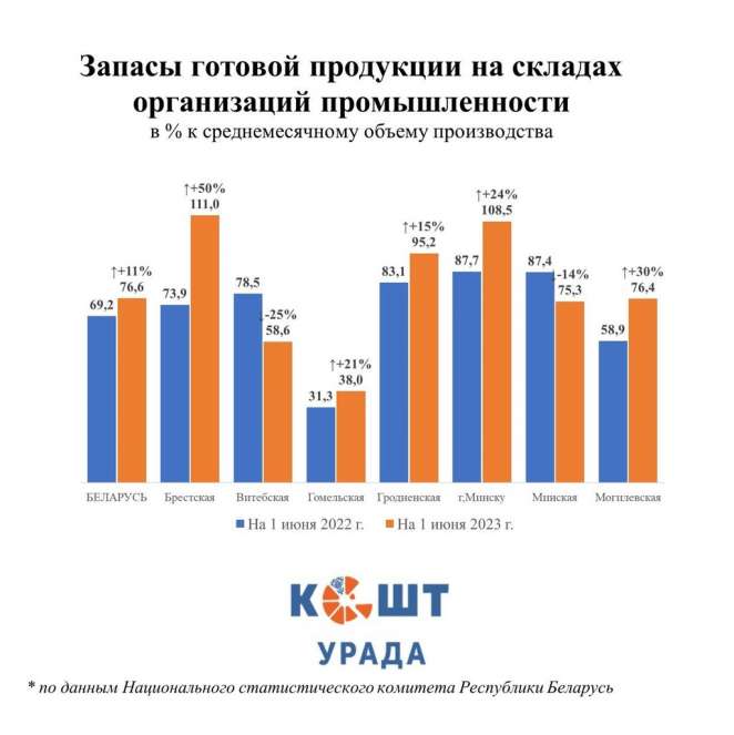 Ситуация с запасами на промскладах по регионам существенно различается. В Брестской области на 1 июня 2023 года складские запасы превышали месячный объем производства на 111,0%, а в Гомельской их было только на треть от месячного объема производства (38%). Кроме того, месячный объем лежит на складах Гродненской области и в столице.