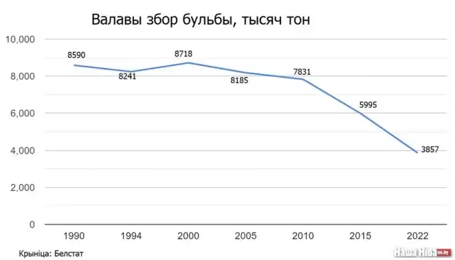 Она свидетельствует, что основное падение производства картофеля пришлось на период после 2010-го года. До этого года показатели колебались из года в год вокруг цифры 8 млн тонн. А в 2004 году был собран рекордный урожай — 9,9 млн тонн. Позже наблюдается резкий спад с 7,8 млн тонн в 2010 году до 3,9 млн тонн в 2022 году.