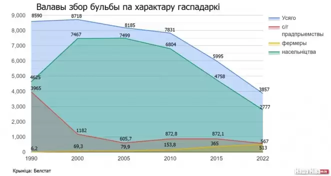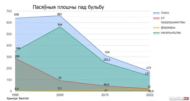 При этом посевные площади под картофель в колхозах (после небольшого подъема в середине 1990-х) постоянно сокращались. В 2000-м они составляли лишь третью часть от площадей 1990-го года. А за 2015-2022 годы сократились более чем вдвое.