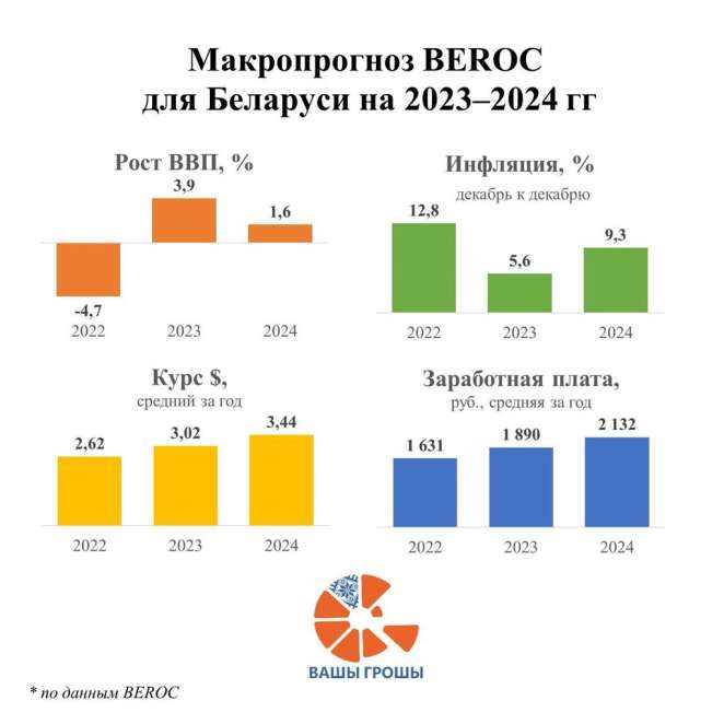 В прогнозе отмечено, что перегретый внутренний спрос и существенное повышение заработных плат формируют условия для увеличения издержек, которые будут приводить к росту цен. Простимулирует инфляцию и ускорение роста цен в России, а также ожидаемое ослабление беларуского рубля к корзине валют. В результате рост цен в 2024 году может ускориться до 9,3%.