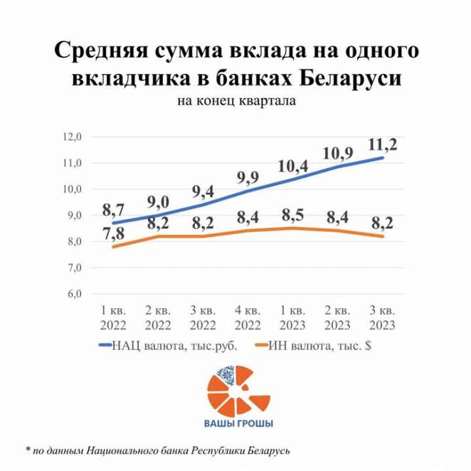 На фоне общей тенденции к сокращению вкладов в иностранной валюте значительно снизился (-3,3%) средний размер безотзывного валютного вклада. В третьем квартале 2023 года средний размер безотзывного валютного вклада составил 10,1 тысячи долларов, а для отзывного показатель составил 5,5 тысячи долларов.