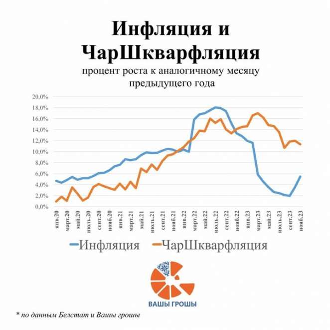 «Начинается период, о котором мы и многие другие независимые аналитики предупреждали давно — цены пошли вверх, годовая инфляция к началу зимы составила 5,4%. При этом немного снизился уровень инфляции в „чарках-шкварках“ — до 11,3%. И чтобы понять, что происходит, надо разобраться в деталях», — отмечают авторы индекса «чарки-шкварки».