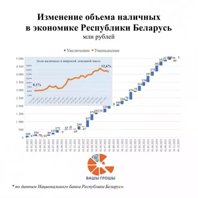 Объем наличных в экономике Беларуси с марта 2022 года стремительно увеличивается. Сейчас это уже 12,6% от всех денег, а в начале 2022 года было около 8%.
