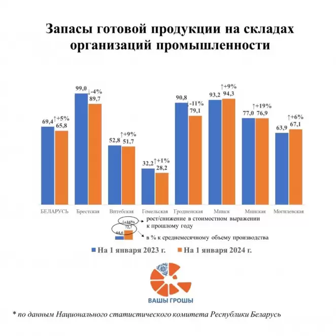 Эти данные свидетельствуют о том, что на промскладах сейчас находится приблизительно трехнедельный запас продукции. Ситуация различается по регионам. В столице на 1 января 2024 года запасы почти соответствовали месячному объему производства, а в Гомельской их было меньше трети от месячного объема производства (28,2%).