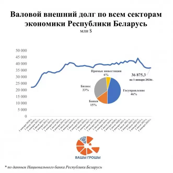 Объем валовой внешней задолженности Беларуси (а это не только госдолг, но и долги зарубежным контрагентам беларусского бизнеса, банков и прочих субъектов) в начале года оставил $36 млрд 875 млн.