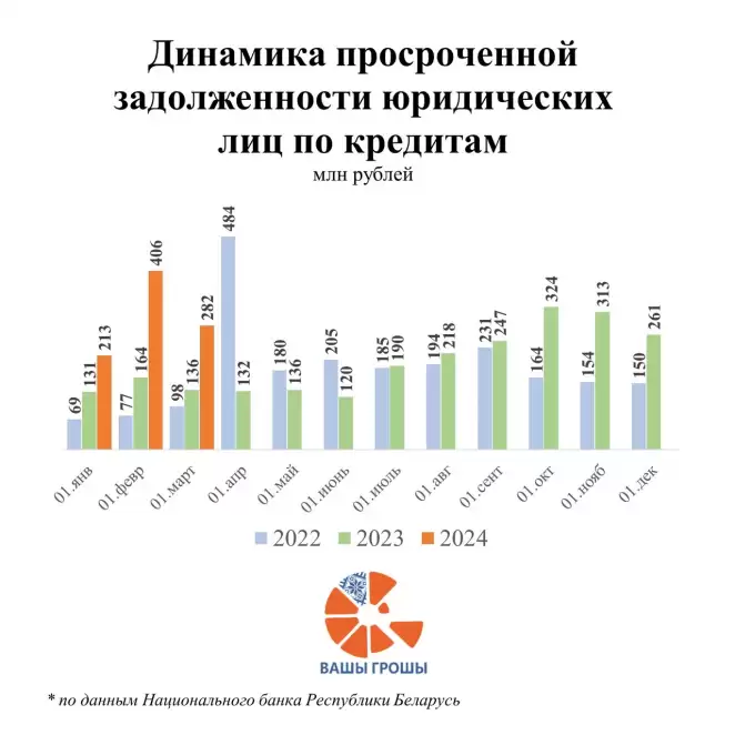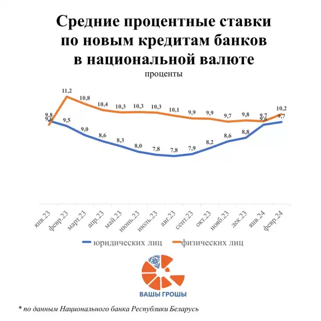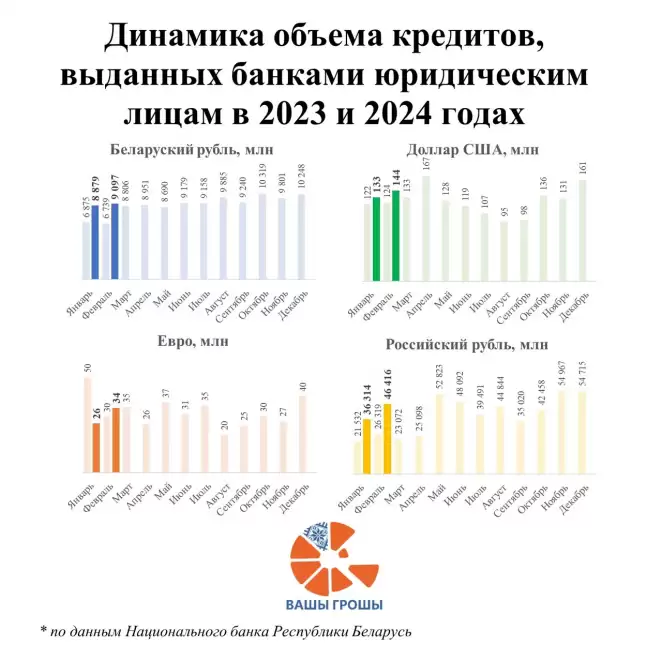 В январе-феврале 2024 года банки выделили на кредитование юридических лиц 22,3 миллиарда беларусских рублей в эквиваленте. Из этой суммы 17,9 миллиарда пришлось на новые кредиты в национальной валюте. Прочие средства были выданы в иностранной валюте: 276,3 миллиона долларов США, 60,2 миллиона евро и 82,7 миллиарда российских рублей.