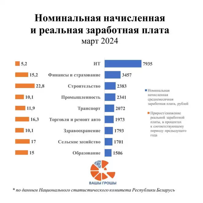 По отношению к марту 2023 года средняя оплата труда с учётом инфляции увеличилась во всех ключевых сферах. Сильнее всего реальные заработки выросли в строительной сфере (+22,8%), сельском хозяйстве (+17,0%), торговле (+16,3%) и финансах (+15,2%).