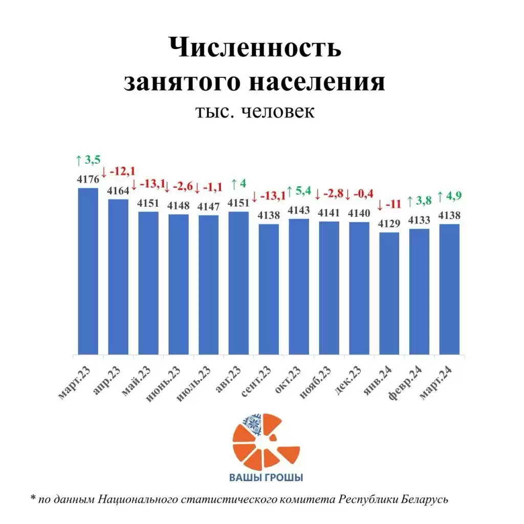 По данным Белстата, в экономике Беларуси в марте 2024 года было занято 4 млн 137,8 тысяч человек или на 4,9 тысяч больше, чем было занято месяцем ранее.