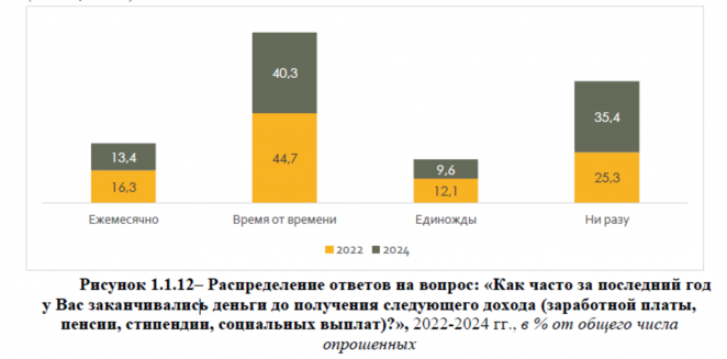 Более половины опрошенных сталкивались с ситуацией нехватки денег до получения следующего дохода (заработной платы, пенсии, стипендии, социальных выплат). Из них 13,4% сталкиваются с недостатком средств ежемесячно, 40,3% – время от времени. По сравнению с 2022 годом стало больше тех, кто с данной проблемой не сталкивается.