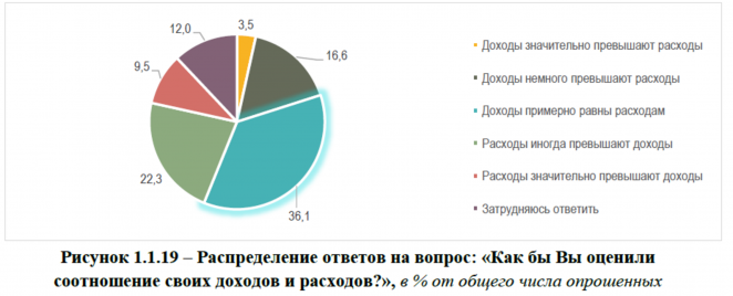 В ходе опроса 9,5% белорусов признались, что их расходы «значительно» превышают доходы, «иногда превышали» – 22,3%. То есть живут не по средствам почти 32% населения. У 36% расходы примерно равны доходам.