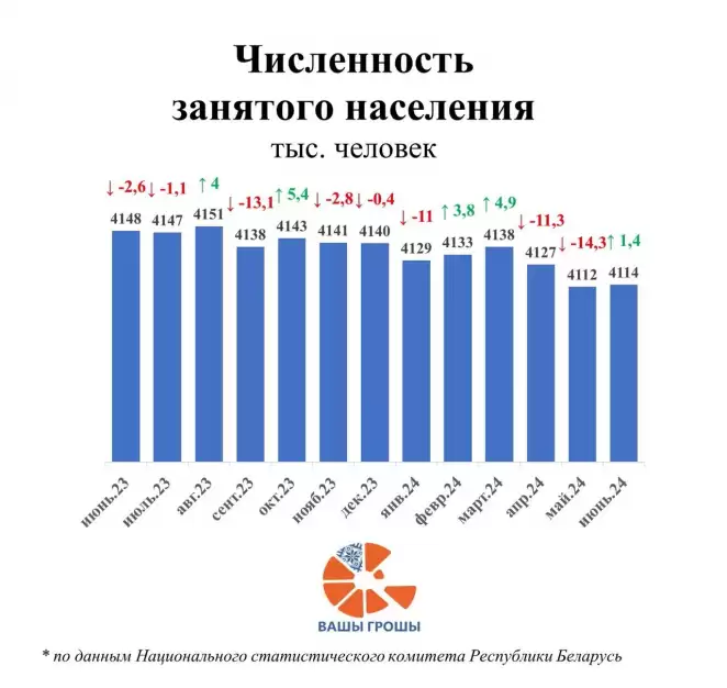 По данным Белстата, в экономике Беларуси в июне 2024 года было занято 4 млн 113,6 тыс. человек или на 1,4 тыс. больше, чем месяцем ранее. Однако, несмотря текущий прирост, общая картина крайне опасна для Беларуси — в целом за первое полугодие экономика потеряла уже более 25 тысяч человек.