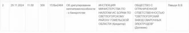 В августе Экономический суд Гомельской области принял решение начать производство по делу о банкротстве ООО «Светлогорский завод сварочных электродов». Основанием послужило обращение налоговой инспекции Светлогорского района.
