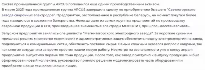 На сайте промышленной группы Arcus сказано, что ООО «Светлогорский завод сварочных электродов» к моменту приобретения находился в состоянии банкротства. Однако это не так, поскольку процесс банкротства завода в Светлогорске был запущен лишь полтора года спустя.