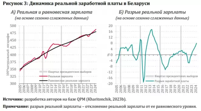 Однако в 2023–2024 годы старые практики стимулирования потребительского спроса в предвыборные годы вернулись. Уровень заработных плат с учетом коррекции на рост цен в II квартале 2024 года уже более чем на 8% превышал сбалансированный, а по сравнению со средним значением довоенного 2021 года он поднялся уже более чем на 22%.