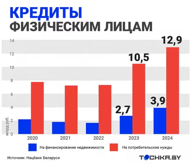 Кроме того, важным направлением финансирования населения оставались займы на недвижимость. За 2024 год их выдали на сумму Br3,9 млрд, что на 44% больше, чем в 2023-м.
