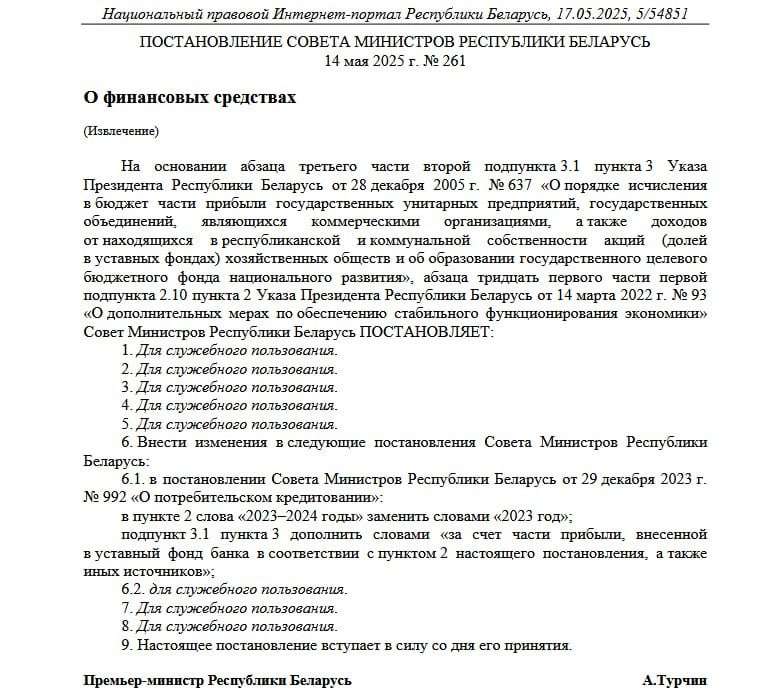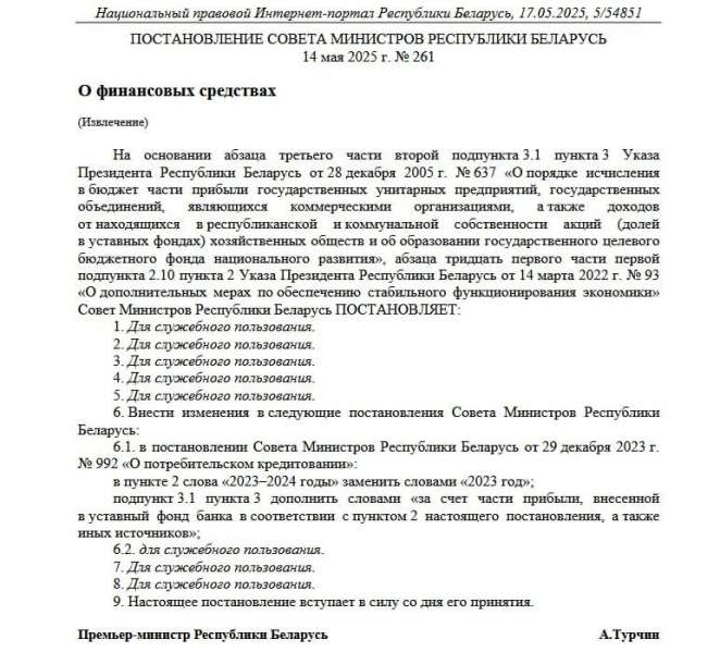 Так, в постановлении Совмина от 14 мая, посвященного регулированию прибыли от госпредприятий, практически все пункты опубликованного документа оказались спрятаны под фразой «Для служебного пользования».
