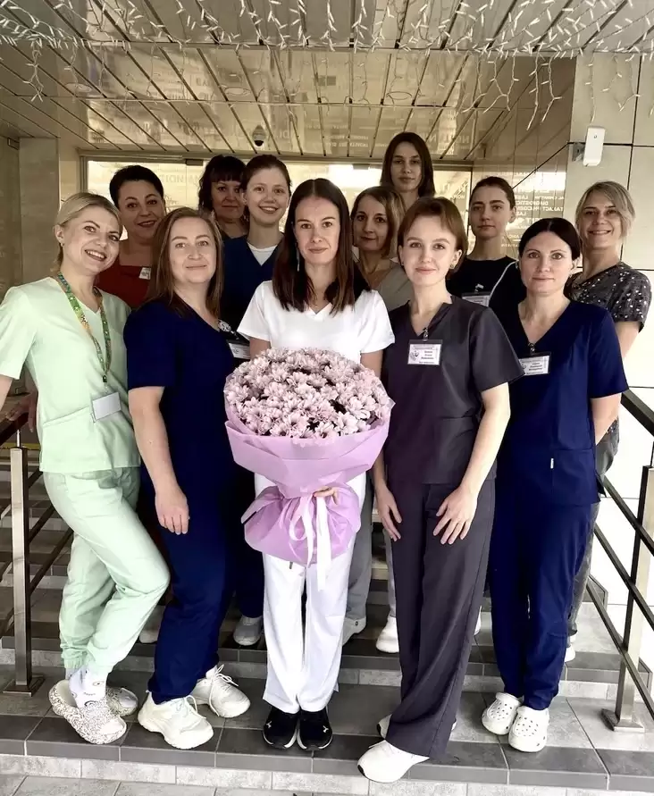 Коллектив нового отделения 10‑й больницы. На заднем плане видны надписи, что были на стеклянных дверях и стенах клиники «Новое зрение». Фото: 10gkb.by