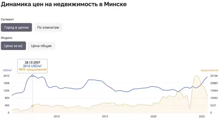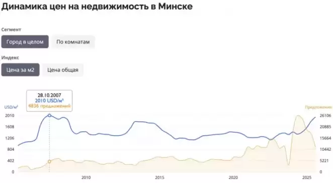 Несмотря на очень интенсивный рост цен в течение 2025 года, абсолютный рекорд конца 2007 года не побит — тогда квадрат в столице по предложениям стоил $2010.